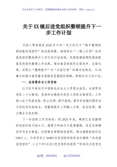 / 关于XX镇后进党组织整顿提升下一步工作计划