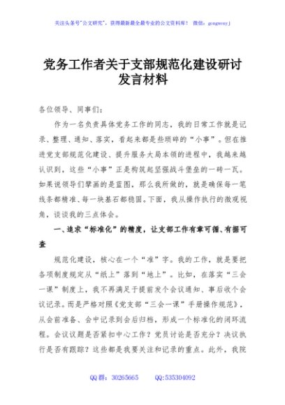 / 党务工作者关于支部规范化建设研讨发言材料
