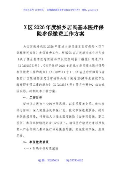 / X区2026年度城乡居民基本医疗保险参保缴费工作方案