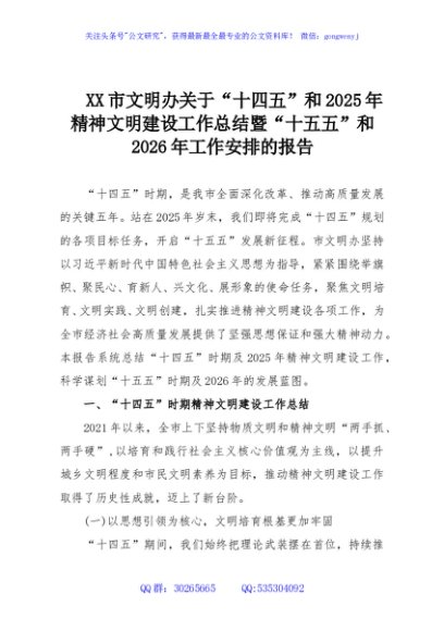 / XX市文明办关于“十四五”和2025年精神文明建设工作总结暨“十五五”和2026年工作安排的报告