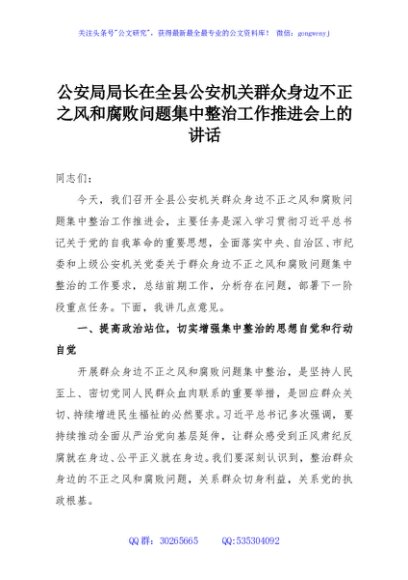 / 公安局局长在全县公安机关群众身边不正之风和腐败问题集中整治工作推进会上的讲话