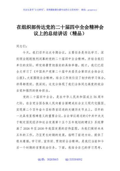 / 在组织部传达党的二十届四中全会精神会议上的总结讲话(精品)