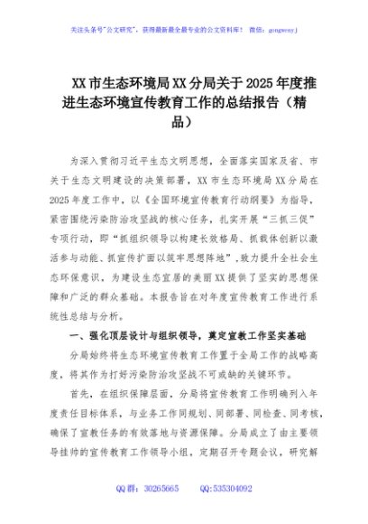 / XX市生态环境局XX分局关于2025年度推进生态环境宣传教育工作的总结报告(精品)