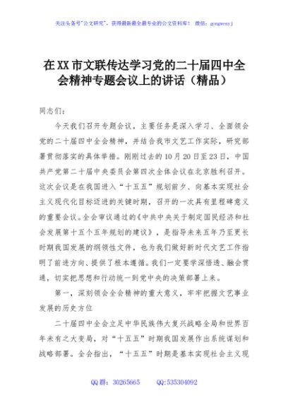 / 在XX市文联传达学习党的二十届四中全会精神专题会议上的讲话(精品)