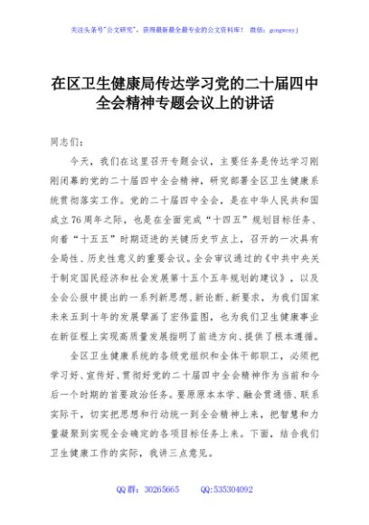 / 在区卫生健康局传达学习党的二十届四中全会精神专题会议上的讲话