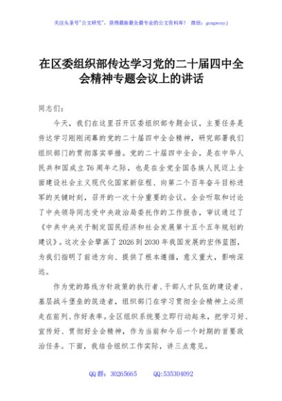 / 在区委组织部传达学习党的二十届四中全会精神专题会议上的讲话