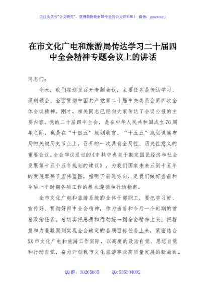 / 在市文化广电和旅游局传达学习二十届四中全会精神专题会议上的讲话