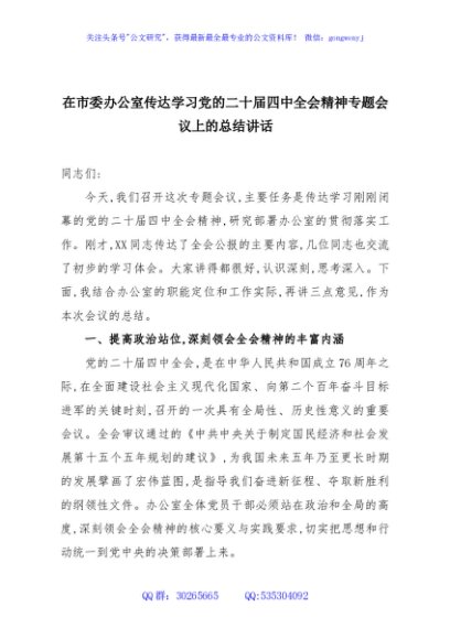 / 在市委办公室传达学习党的二十届四中全会精神专题会议上的总结讲话