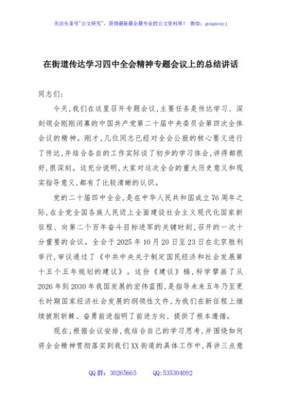/ 在街道传达学习四中全会精神专题会议上的总结讲话