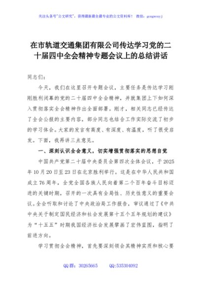 / 在市轨道交通集团有限公司传达学习党的二十届四中全会精神专题会议上的总结讲话