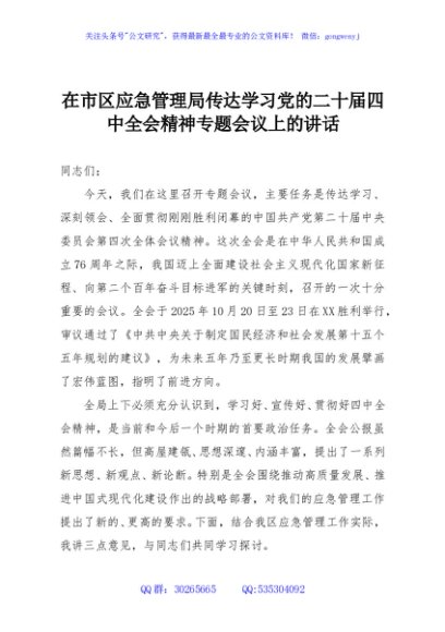 / 在市区应急管理局传达学习党的二十届四中全会精神专题会议上的讲话