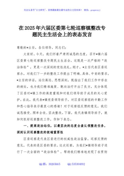 / 在2025年六届区委第七轮巡察镇整改专题民主生活会上的表态发言