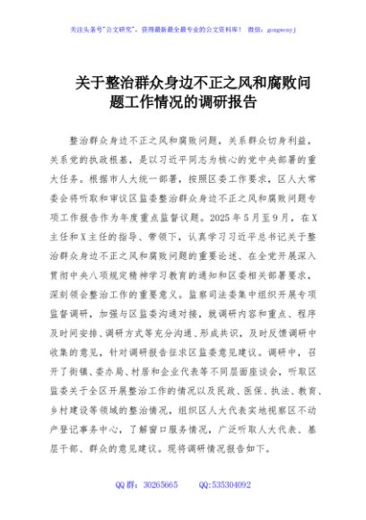 / 关于整治群众身边不正之风和腐败问题工作情况的调研报告