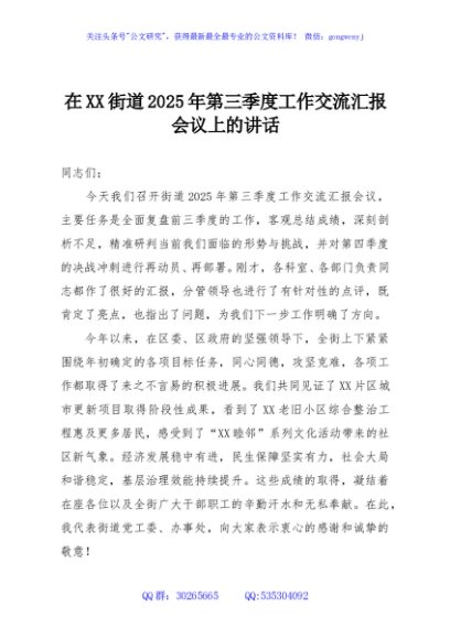 / 在XX街道2025年第三季度工作交流汇报会议上的讲话