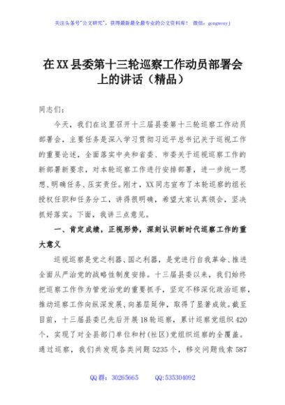 / 在XX县委第十三轮巡察工作动员部署会上的讲话(精品)