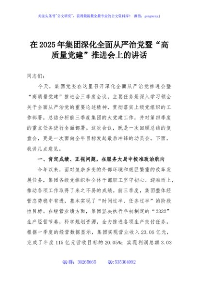 / 在2025年集团深化全面从严治党暨“高质量党建”推进会上的讲话