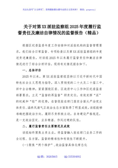/ 关于对第XX派驻监察组2025年度履行监督责任及廉洁自律情况的监督报告(精品)