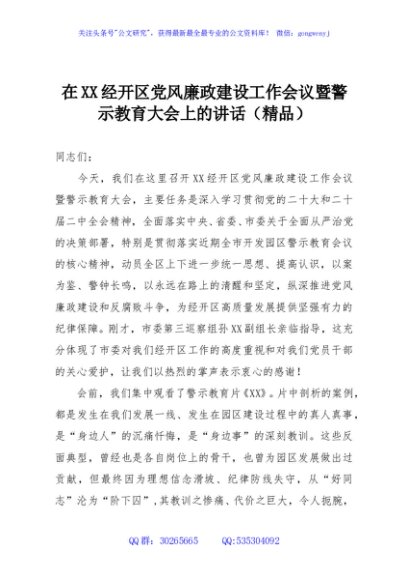 / 在XX经开区党风廉政建设工作会议暨警示教育大会上的讲话(精品)
