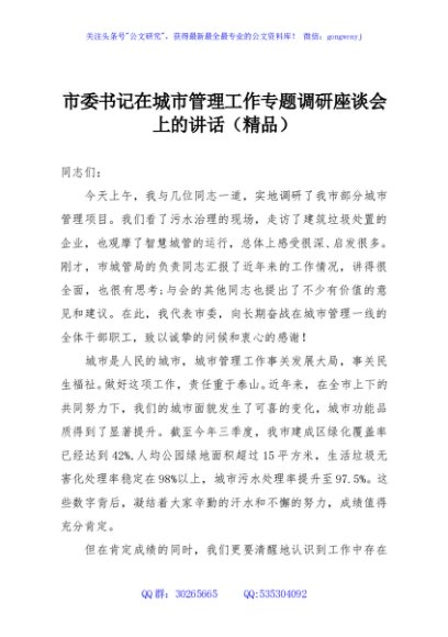 / 市委书记在城市管理工作专题调研座谈会上的讲话(精品)