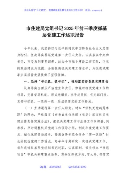 / 市住建局党组书记2025年前三季度抓基层党建工作述职报告