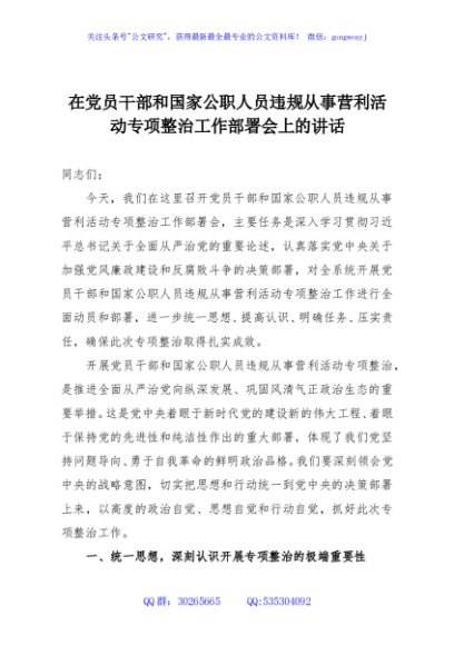 / 在党员干部和国家公职人员违规从事营利活动专项整治工作部署会上的讲话
