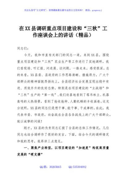 / 在XX县调研重点项目建设和“三秋”工作座谈会上的讲话(精品)