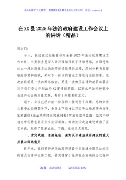 / 在XX县2025年法治政府建设工作会议上的讲话(精品)