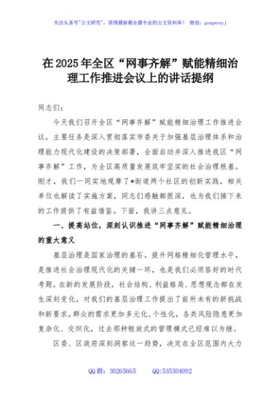 / 在2025年全区“网事齐解”赋能精细治理工作推进会议上的讲话提纲