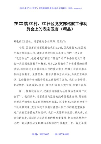 在XX镇XX村、XX社区党支部巡察工作动员会上的表态发言(精品)