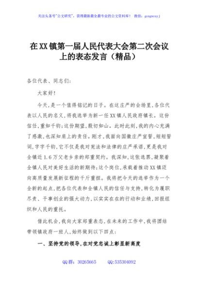 / 在XX镇第一届人民代表大会第二次会议上的表态发言(精品)