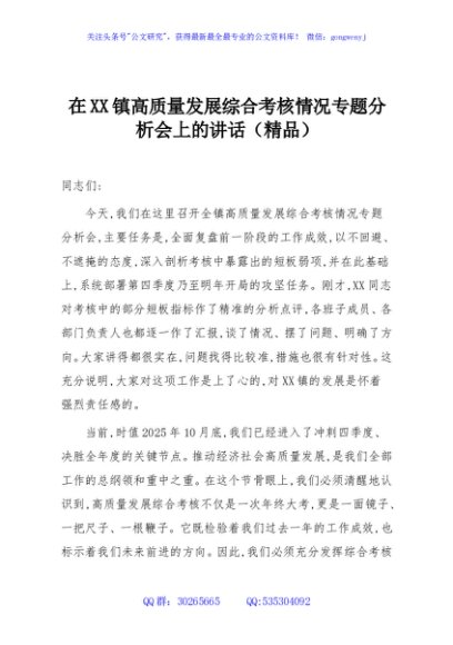/ 在XX镇高质量发展综合考核情况专题分析会上的讲话(精品)
