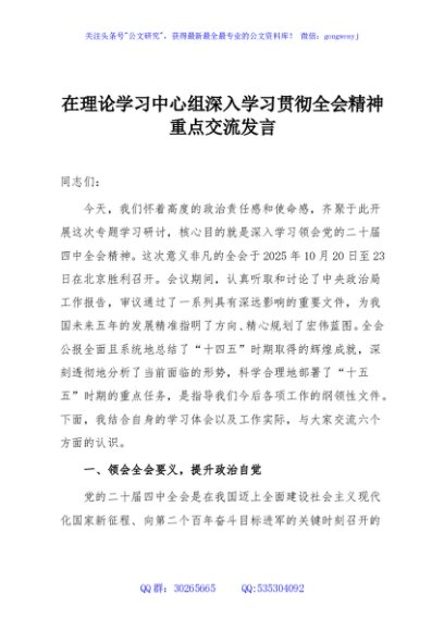 / 在理论学习中心组深入学习贯彻全会精神重点交流发言