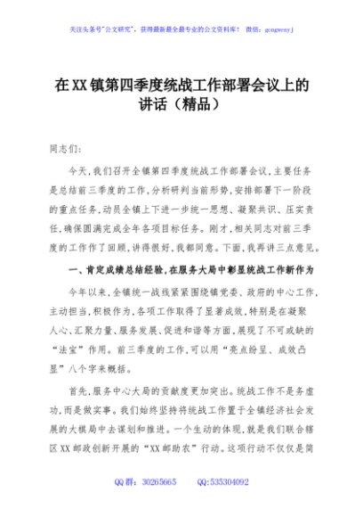 / 在XX镇第四季度统战工作部署会议上的讲话(精品)