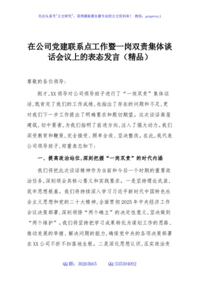 / 在公司党建联系点工作暨一岗双责集体谈话会议上的表态发言(精品)