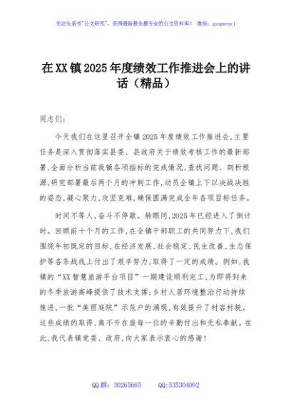 / 在XX镇2025年度绩效工作推进会上的讲话(精品)