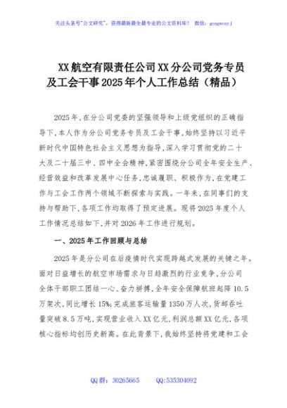 XX航空有限责任公司XX分公司党务专员及工会干事2025年个人工作总结(精品)