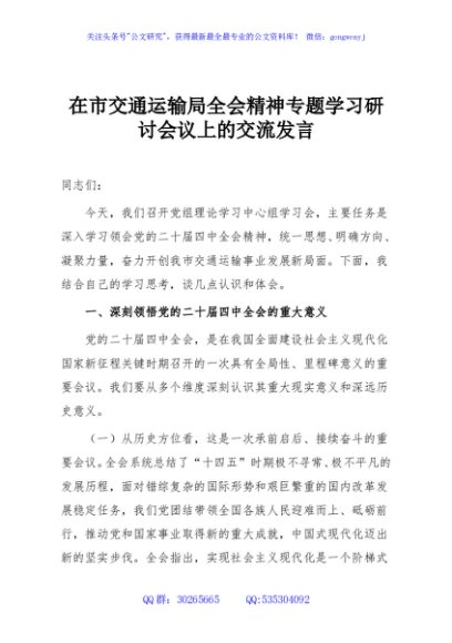 / 在市交通运输局全会精神专题学习研讨会议上的交流发言