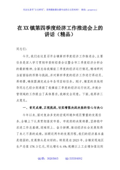 / 在XX镇第四季度经济工作推进会上的讲话(精品)