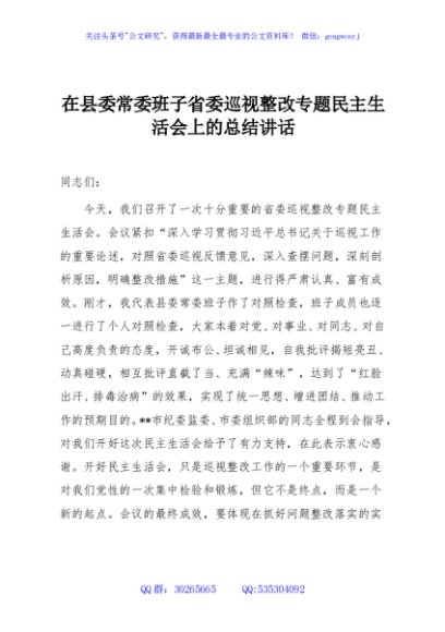 / 在县委常委班子省委巡视整改专题民主生活会上的总结讲话