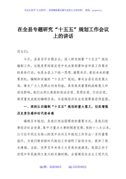 / 在全县专题研究“十五五”规划工作会议上的讲话