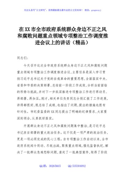 / 在XX市全市政府系统群众身边不正之风和腐败问题重点领域专项整治工作调度推进会议上的讲话(精品)