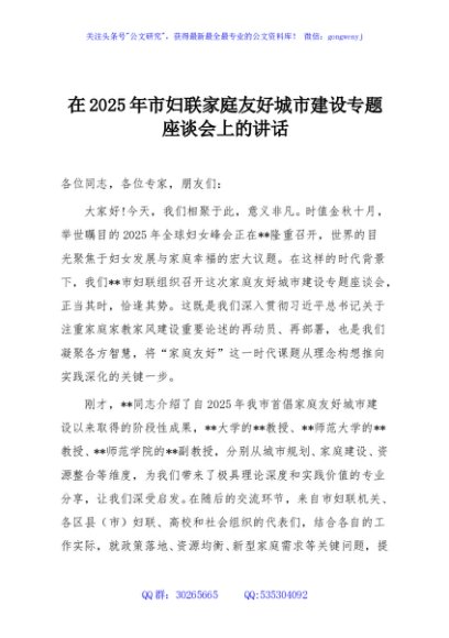 / 在2025年市妇联家庭友好城市建设专题座谈会上的讲话