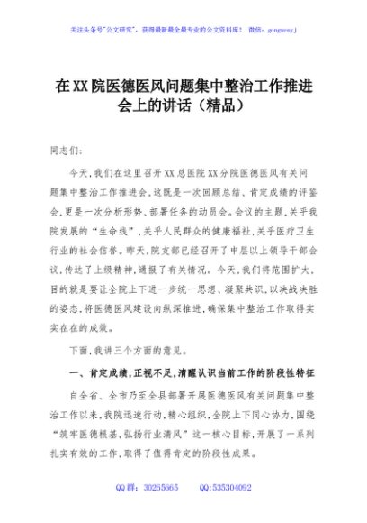 / 在XX院医德医风问题集中整治工作推进会上的讲话(精品)