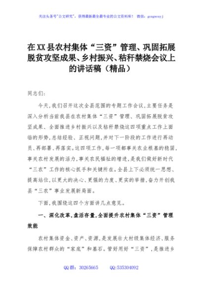 / 在XX县农村集体“三资”管理、巩固拓展脱贫攻坚成果、乡村振兴、秸秆禁烧会议上的讲话稿(精品)