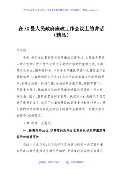 / 在XX县人民政府廉政工作会议上的讲话(精品)