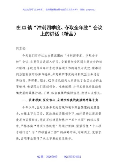/ 在XX镇“冲刺四季度、夺取全年胜”会议上的讲话(精品)