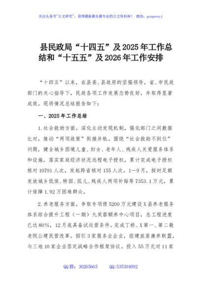 / 县民政局“十四五”及2025年工作总结和“十五五”及2026年工作安排