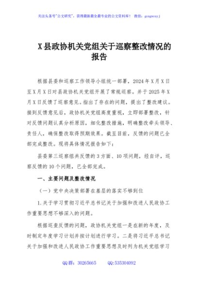/ X县政协机关党组关于巡察整改情况的报告