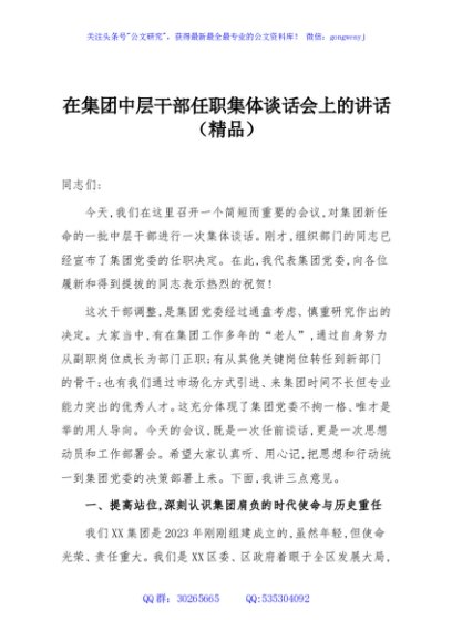 / 在集团中层干部任职集体谈话会上的讲话(精品)
