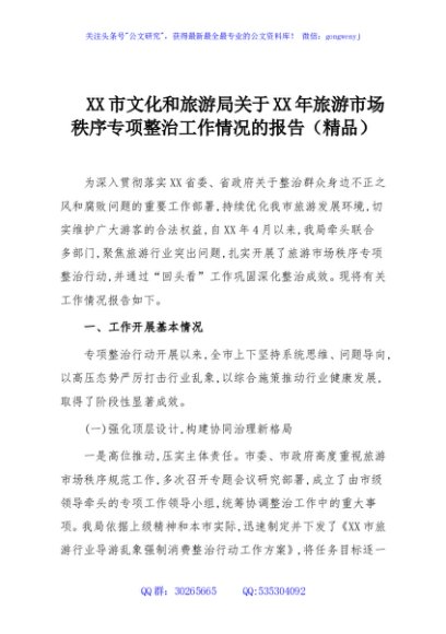 / XX市文化和旅游局关于XX年旅游市场秩序专项整治工作情况的报告(精品)